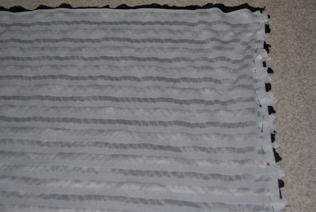 Then I put the ends of the fabric together, pretty side to pretty side, pinning it down and making sure the ruffles were meeting up and lying flat together.  This part is very important especially when you sew the seam.  It would be a pain if some ruffles don’t meet up and go different ways.
