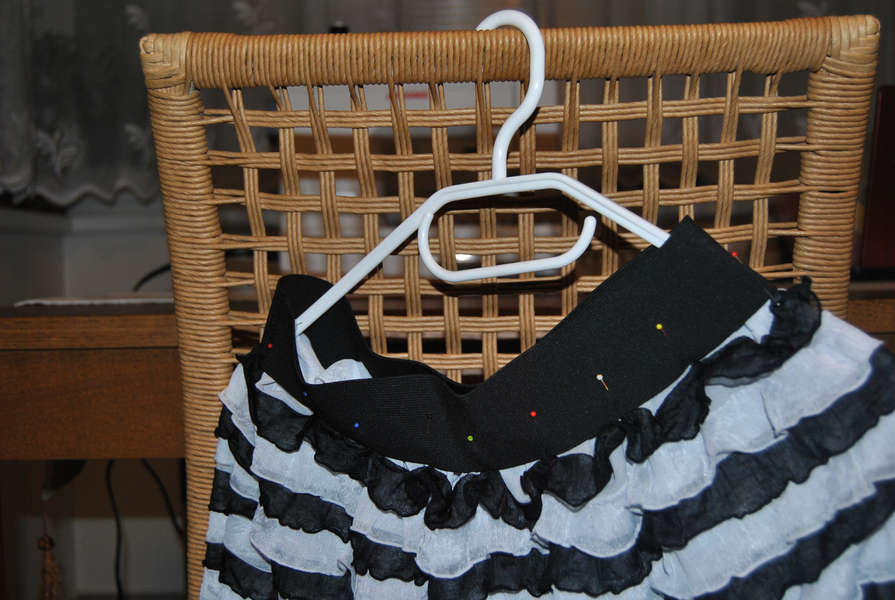 It looked like this with so many pins attached.   Then it was time for the last step — sewing the fabric and elastic together.  I did my seam at the bottom part of the elastic, about 1/8 inch above the first (black) ruffle.  As I was sewing, I stretched the elastic  on both sides to match or fill in gaps of the fabric.