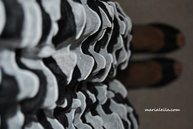 For the length, I used another skirt as basis, leaving an extra ruffle to the measurement. I cut the excess of the fabric with the ruffles going vertical from me.