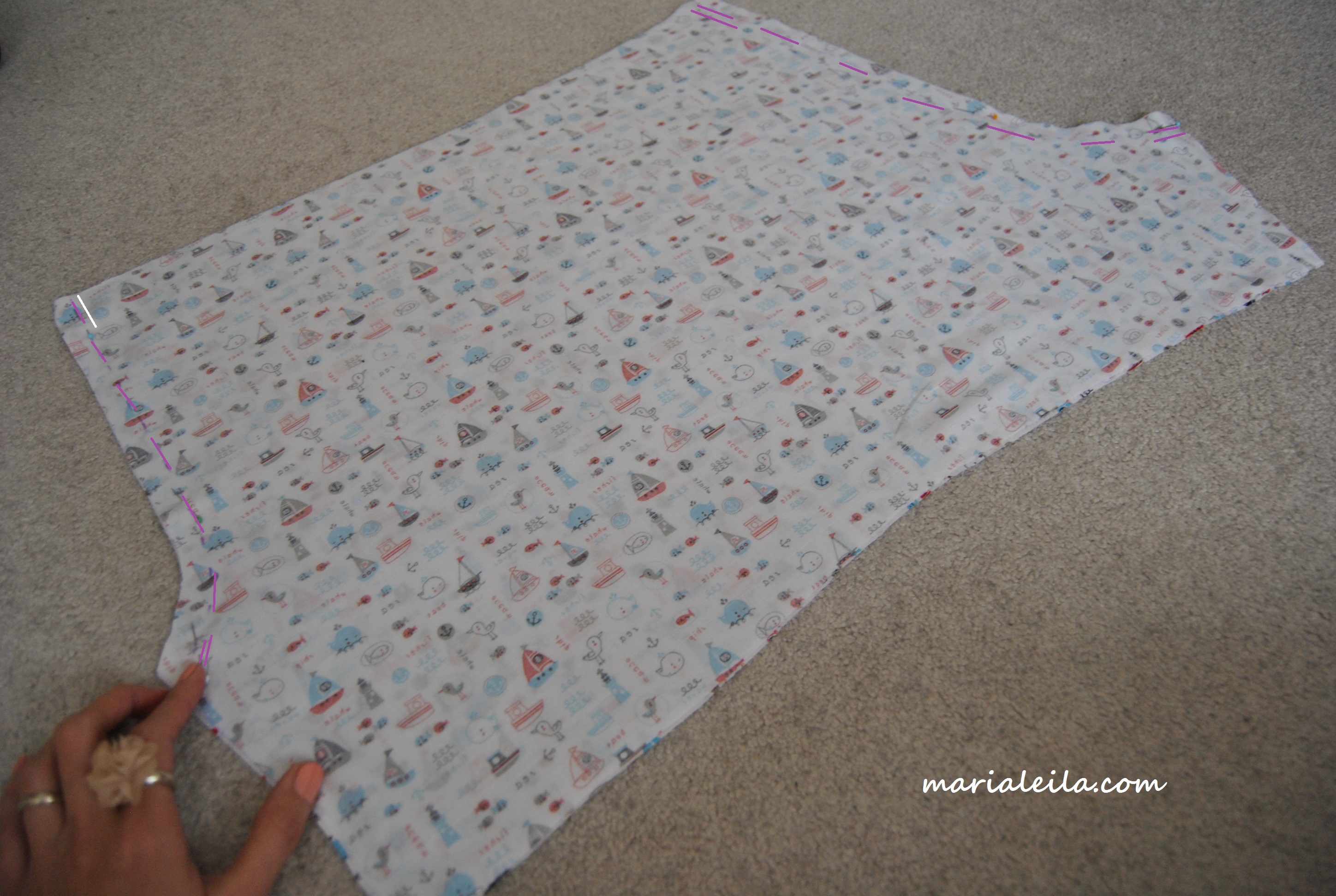 0052.  Put fabric together, right sides touching.  As shown in the photo above,  I used a marker to guide where I start and end my seams.