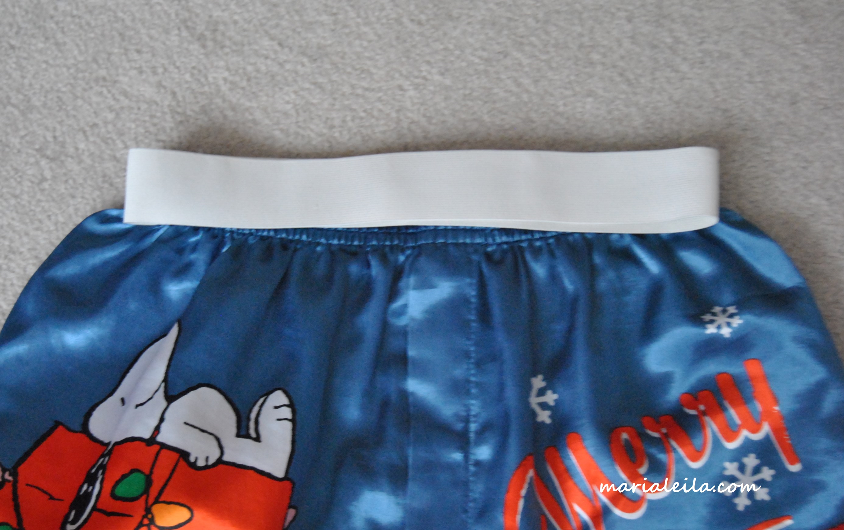 0106.  Now the elastic waistband.  What I did was doubling the measurement of my husband’s (Christmas) boxers, adding an inch overlap.  Stitch the overlap shut to form a loop.