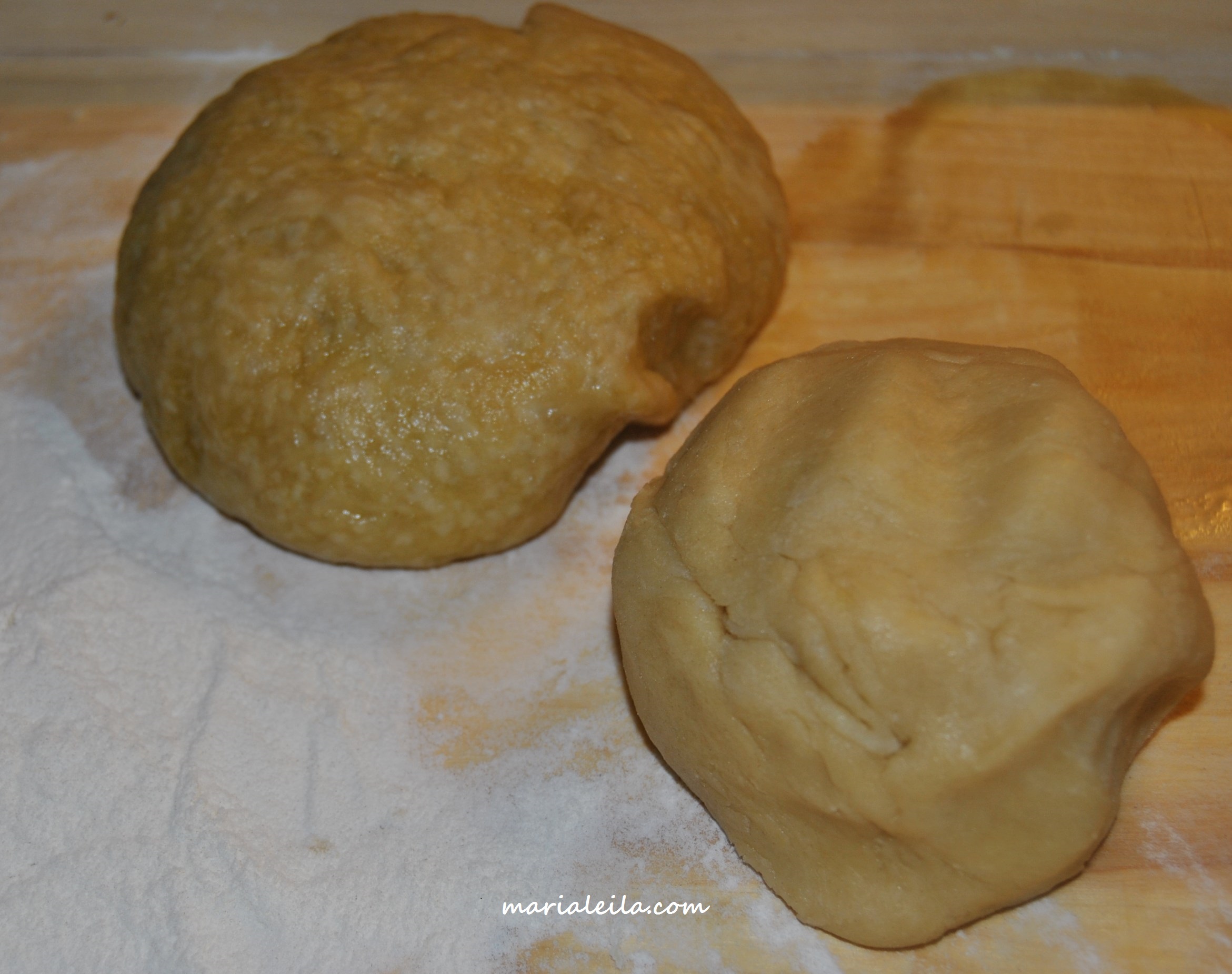 2. Prepare two different sets of dough by mixing the ingredients. Knead on a floured surface till both pieces are not sticky. Let them sit for about 15 minutes.