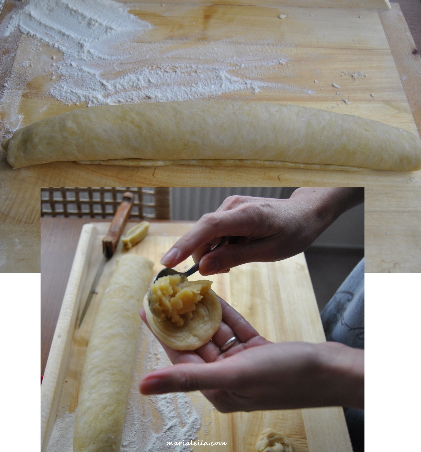 4. Roll dough like in the photo above. Cut into about 2cm thick and roll it into a small disk. Fill with the chilled mung beans and gather the edges. Put into a lined baking pan.