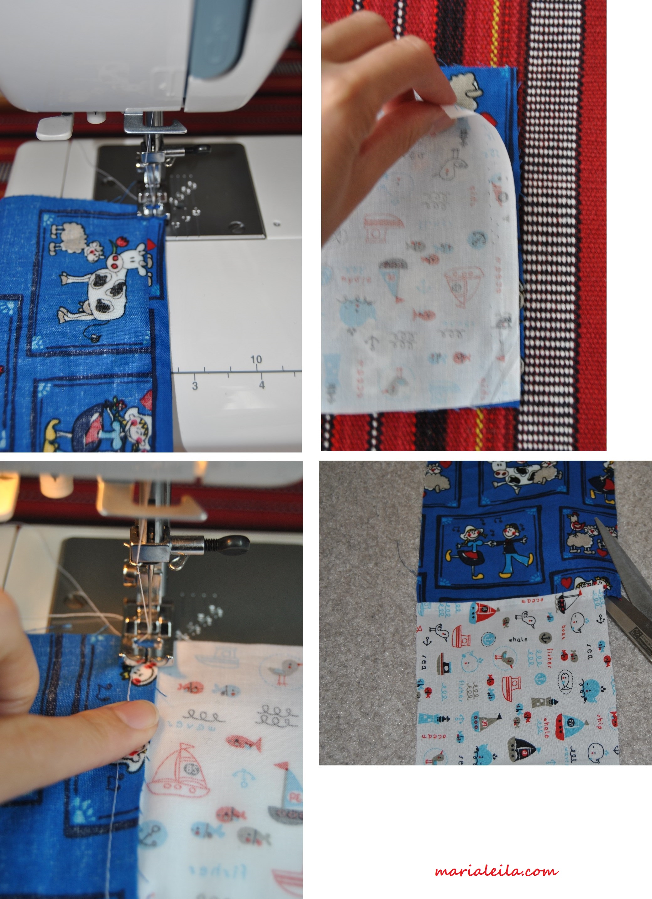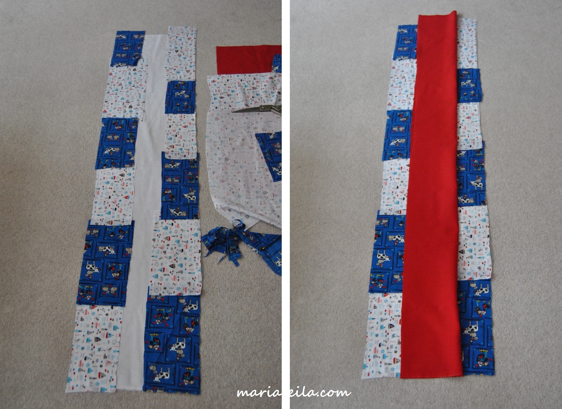 Start by stitching the short sides of the fabrics together. As shown on top-right photo, you do this by putting the fabrics right sides together and stitching them with about a centimeter seam.