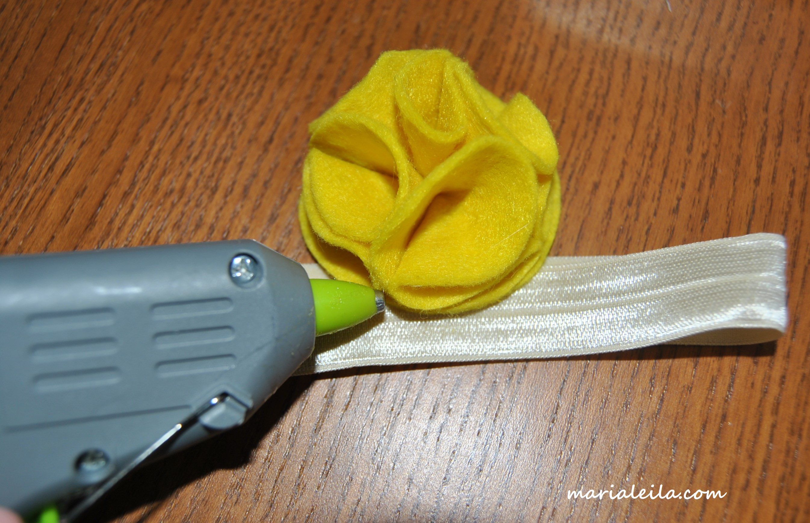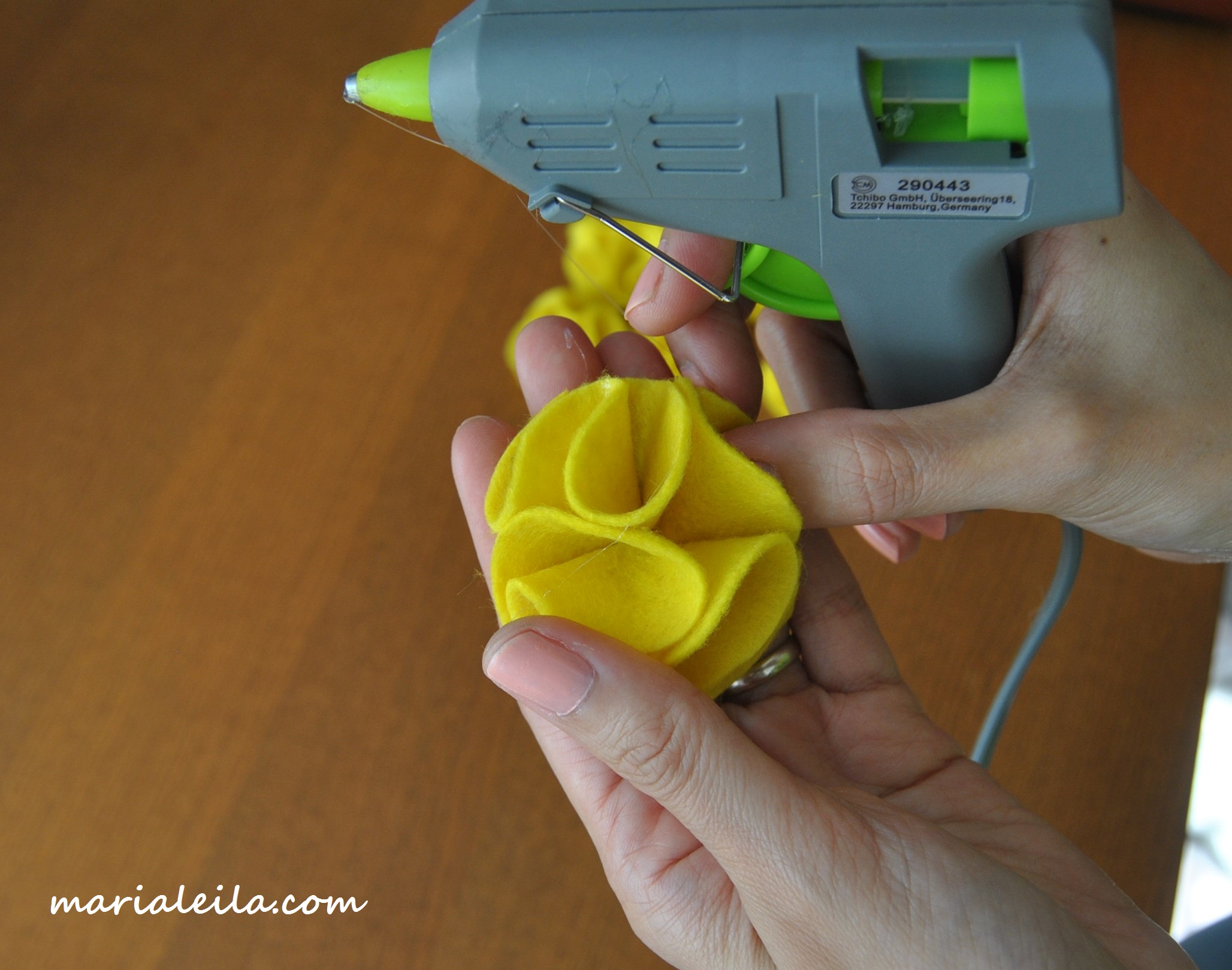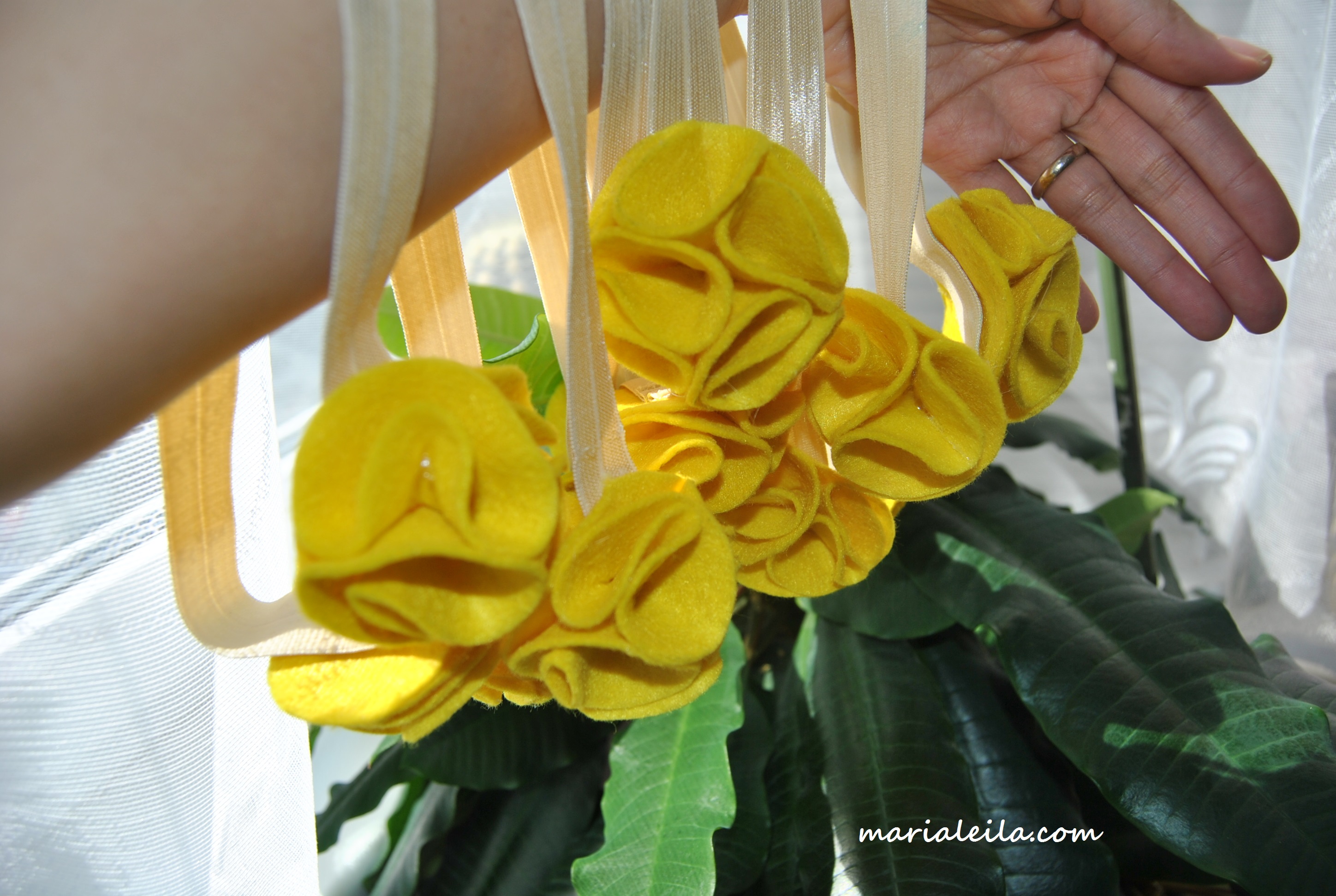 I was looking for an idea for something that will coordinate the little kids’ “look” for their year-end presentation at school. They had to wear light green shirts for boys or dresses for girls but I knew the color would be interpreted in different shades hence that little something to harmonize them. Then I saw a bunch of yellow felt fabric at Tesco and got immediately inspired to make flower headbands and brooches.