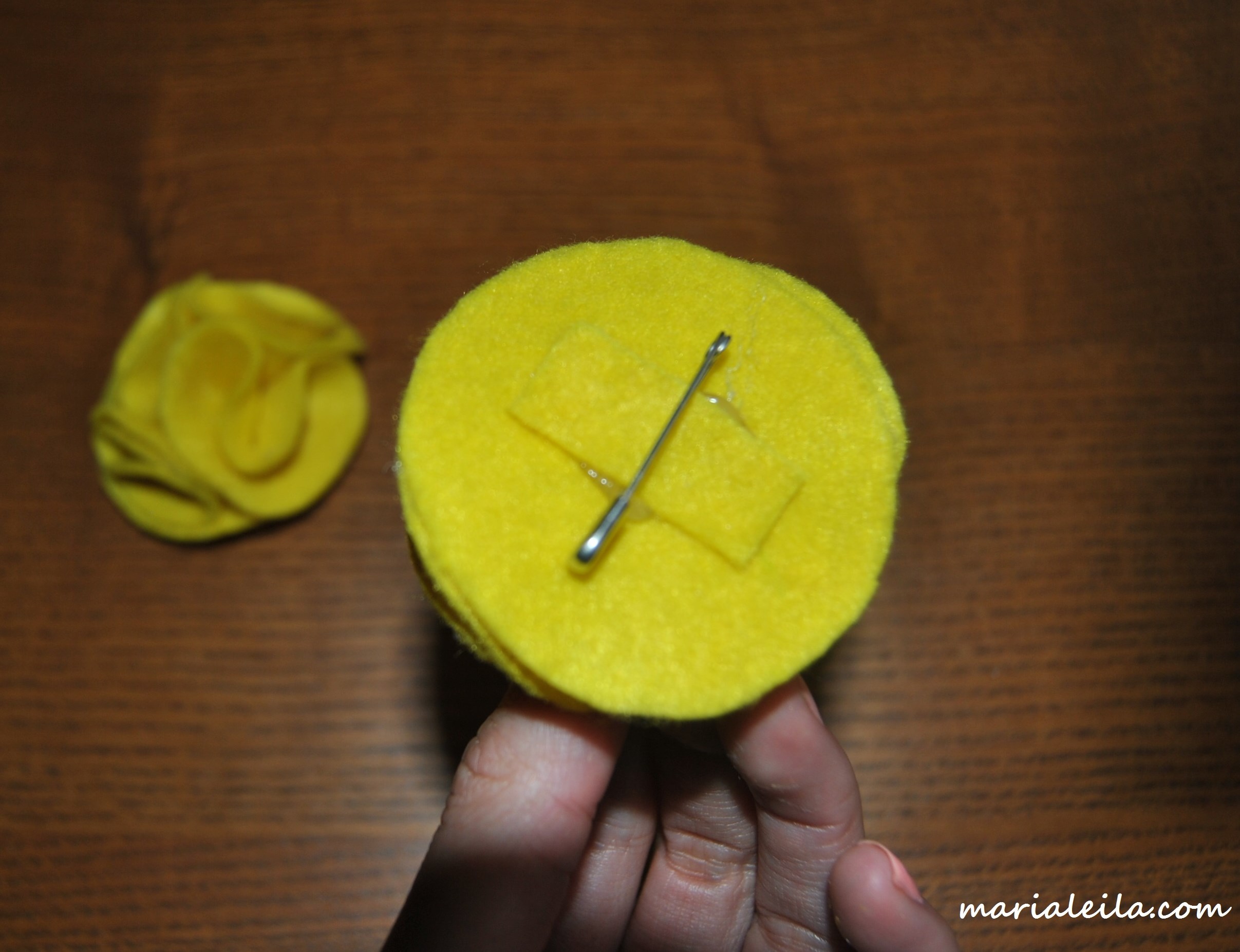I made brooches for the boys so instead of gluing the flower to the elastic, just glue a safety-pin on the back as shown below: