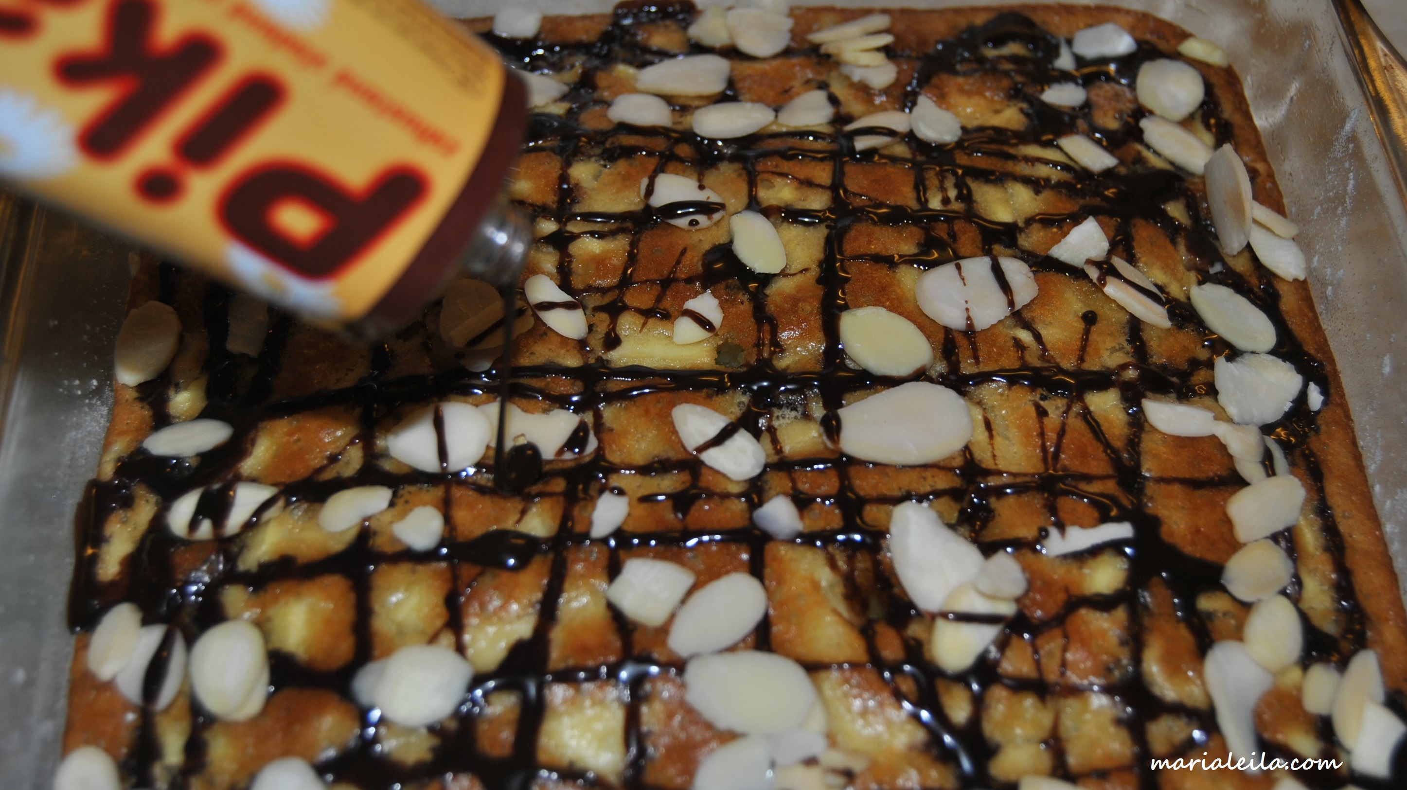 6. Take out from the oven and decorate with condensed milk or chocolate topping and almonds. Put back in the oven for about 5 minutes or until almonds turn a bit brown.