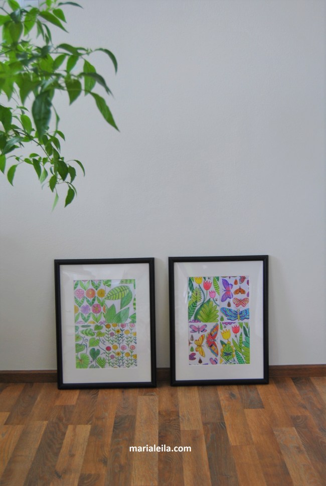 Our hallway walls have been quite empty since we moved in to this aparment three years ago. One part is now decorated a bit, thanks to these framed colored pages.